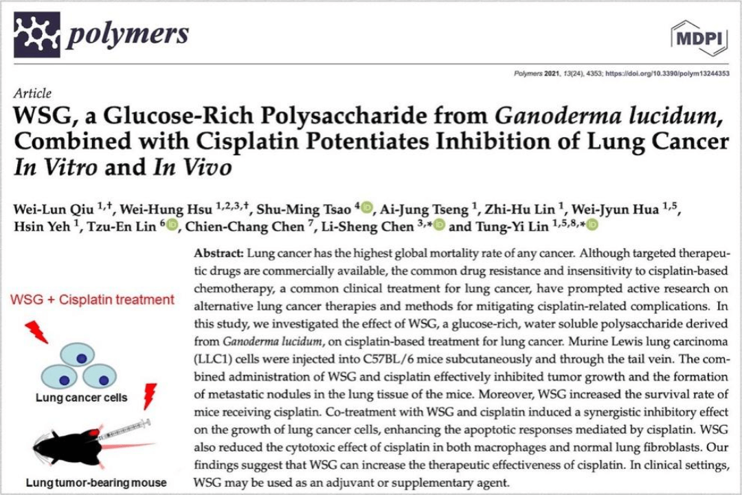 The research published in the December 2021 issue of the “International Journal of Biological Macromolecules” by Associate Professor Tung-Yi Lin et al. from the Institute of Traditional Medicine of National Yang Ming Chiao Tung University in Taiwan proved through cell and animal experiments that WSG (Water Soluble Polysaccharide derived from Ganoderma lucidum) can not only improve the inhibitory effect of the chemotherapy drug cisplatin on lung adenocarcinoma but also protect immune cells and normal cells and greatly increase the survival rate of experimental animals.