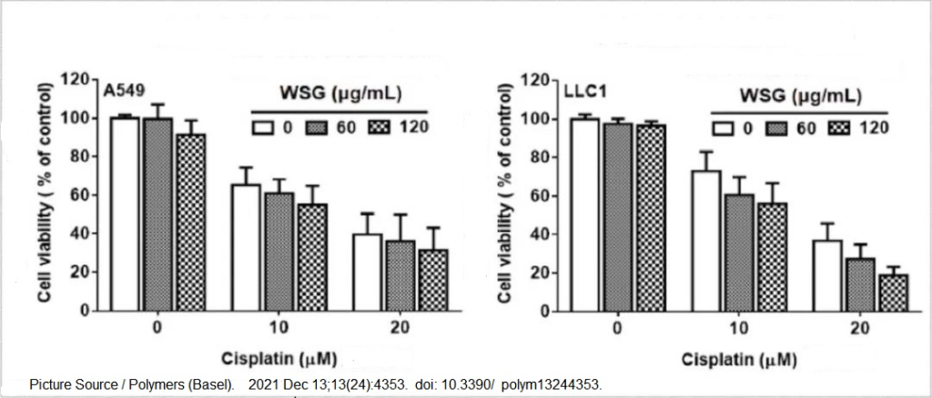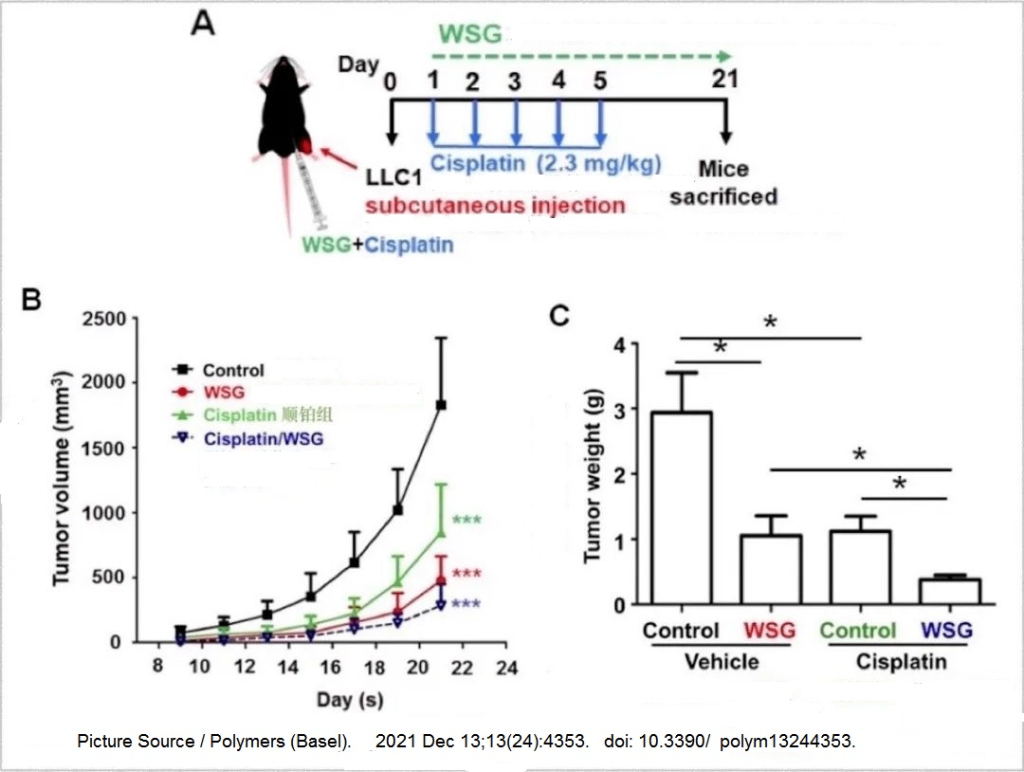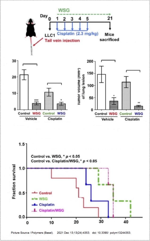 [Source] Wei-Lun Qiu, et al. WSG, a Glucose-Rich Polysaccharide from Ganoderma lucidum, Combined with Cisplatin Potentiates Inhibition of Lung Cancer In Vitro and In Vivo. Polymers (Basel). 2021;13(24):4353 .