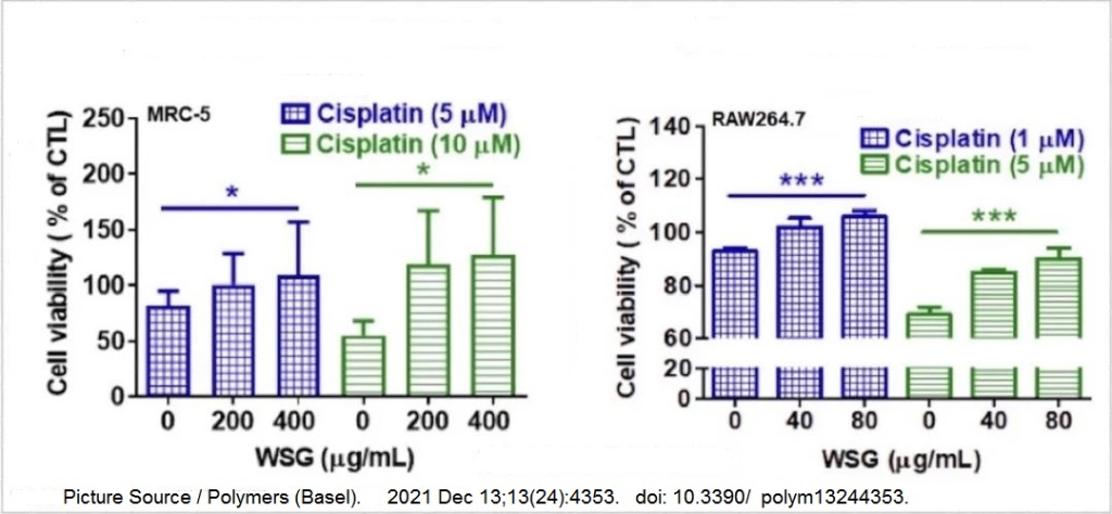 WSG alone has no harm to cancer cells and normal cells while cisplatin alone can damage both cancer cells and normal cells. However, combined administration of WSG and cisplatin can reduce the survival rate of cancer cells and strive for more survival space for normal cells, showing that WSG has the effect of increasing the efficacy of cisplatin and reducing the toxicity of cisplatin.